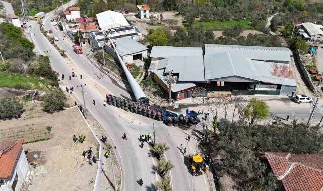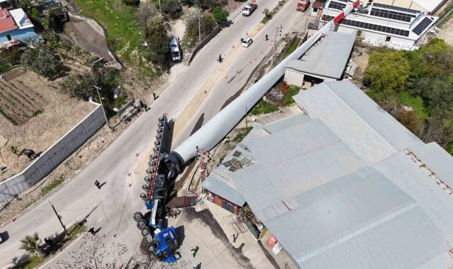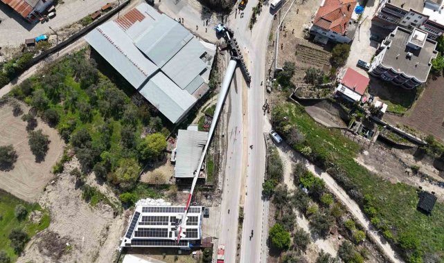 Çanakkale'de devrilen tırın taşıdığı rüzgar gülü kanadının plastik sandık fabrikası üzerine yıkıldığı kaza dronla görüntülendi. Kazada 75 metrelik kanat fabrika ile bir dama zarar verdi.