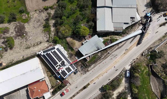 Fabrika üstüne yıkılan rüzgar gülü kanadı dronla görüntülendi
