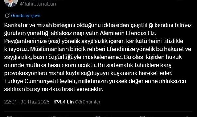 Cumhurbaşkanlığı İletişim Başkanı Fahrettin Altun, Hazreti Muhammed'e yönelik yayınlanan saygısız karikatüre sert tepki gösterdi. Altun sosyal medya hesabından yaptığı paylaşımda şu ifadelere yer verdi: