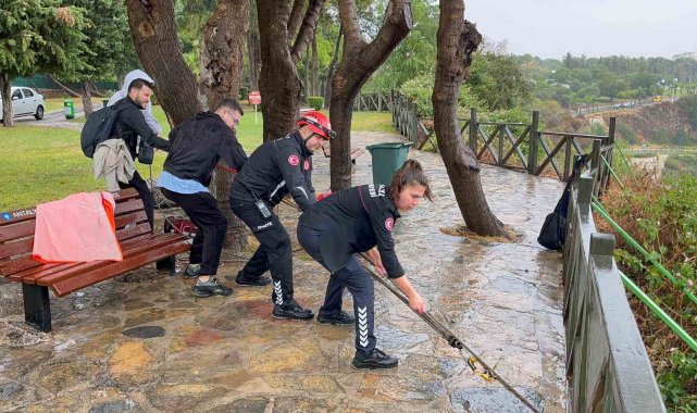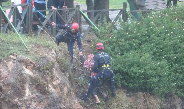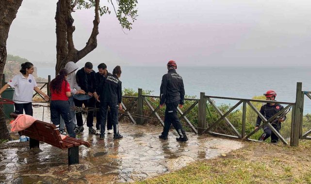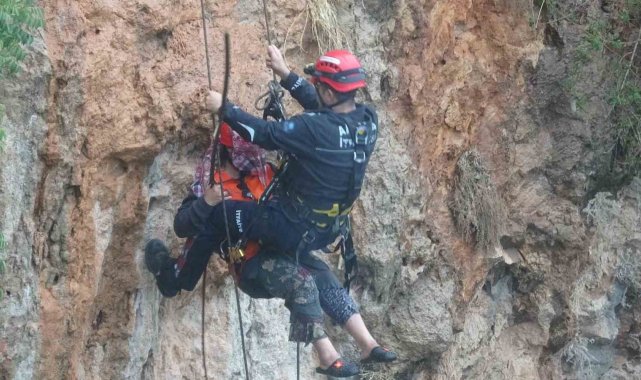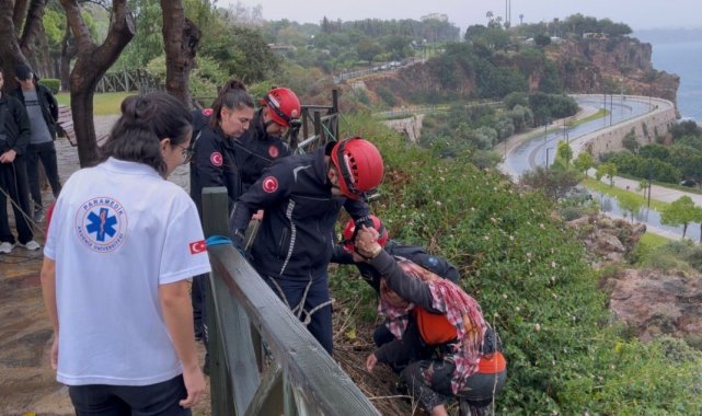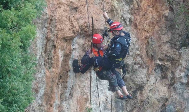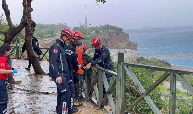 Antalya'da indiği falezlerden yağış nedeniyle geri çıkamayan kadın mahsur kaldı. İtfaiye ekipleri tarafından halat yardımıyla yukarı çekilen kadın kurtarıldı.