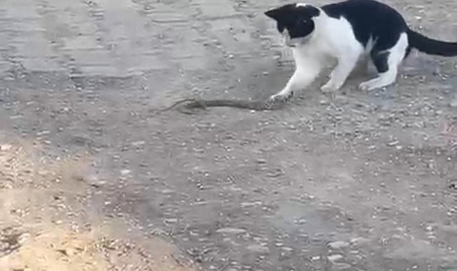 Siirt'in Kurtalan ilçesinde kedi, fareyle oynar gibi yılanla bir süre oynadıktan sonra, hayvanı ağzıyla kapıp uzaklaştı. O anlar cep telefonu kamerasına yansıdı.