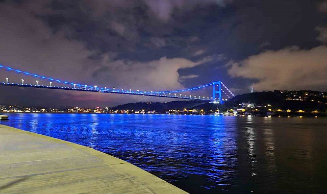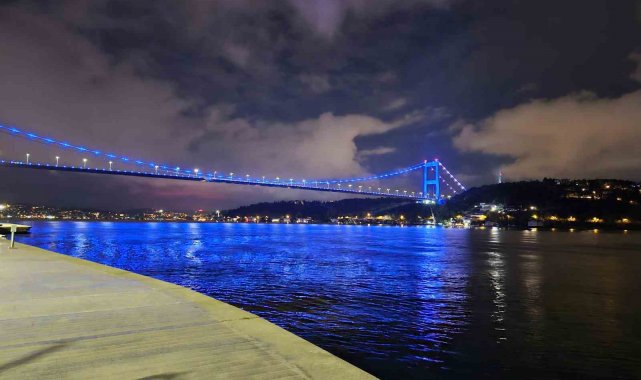 Kamuda Çalışan Engelliler Derneği girişimleriyle Karayolları Genel Müdürlüğü tarafından ışıkla mavi renge bürünen FSM Köprüsü, Beşiktaş'tan görüntülendi.