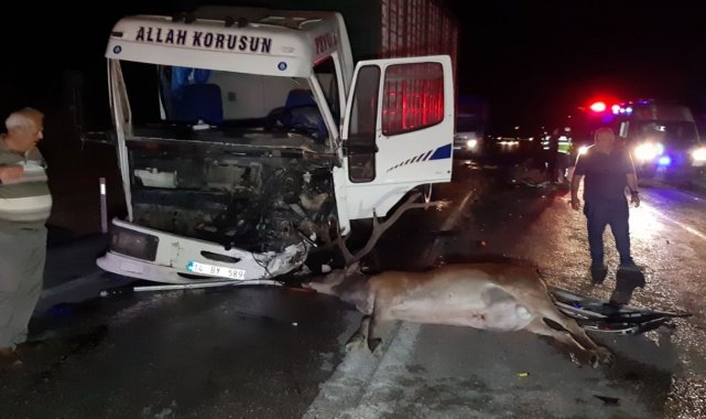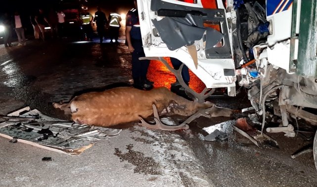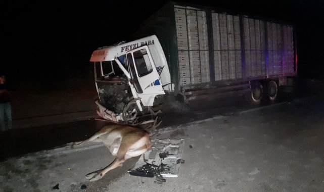 Bolu'da gece saatlerinde yola aniden çıkan bir geyiğe çarpan hafif ticari araç, ardından karşı yönden gelen tavuk yüklü kamyonla çarpıştı. Kazada hafif ticari aracın sürücüsü hayatını kaybederken, kamyon sürücüsü ise yaralandı.