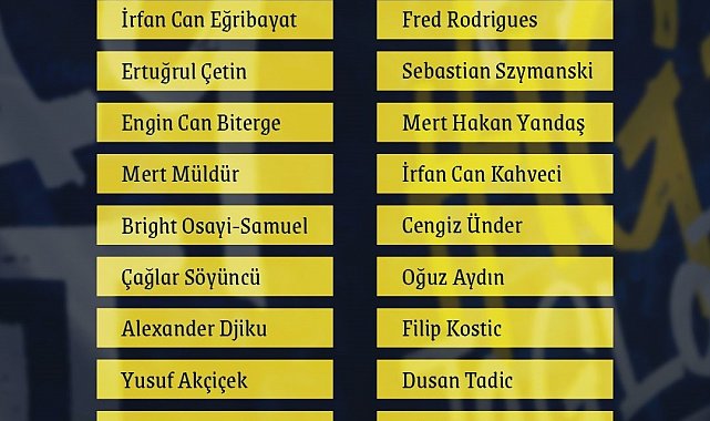 "İrfan Can Eğribayat, Osman Ertuğrul Çetin, Engin Can Biterge, Mert Müldür, Bright Osayi-Samuel, Çağlar Söyüncü, Alexander Djiku, Yusuf Akçiçek, Levent Mercan, Sofyan Amrabat, Bartuğ Elmaz, Fred Rodrigues, Sebastian Szymanski, Mert Hakan Yandaş, İrfan Can Kahveci, Cengiz Ünder, Oğuz Aydın, Filip Kostic, Dusan Tadic, Edin Dzeko, Youssef En-Nesyri, Cenk Tosun."
