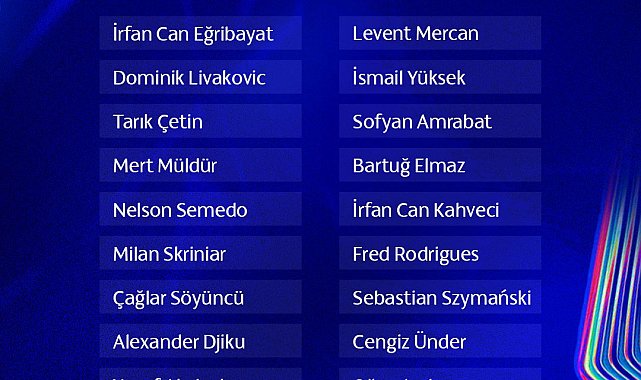 "İrfan Can Eğribayat, Dominik Livakovic, Tarık Çetin, Mert Müldür, Nelson Semedo, Milan Skriniar, Çağlar Söyüncü, Alexander Djiku, Yusuf Akçiçek, Yiğit Efe Demir, Jayden Oosterwolde, Archie Brown, Levent Mercan, İsmail Yüksek, Sofyan Amrabat, Bartuğ Elmaz, İrfan Can Kahveci, Fred Rodrigues, Sebastian Szymanski, Cengiz Ünder, Oğuz Aydın, Anderson Talisca, Youssef En-Nesyri ve Jhon Duran."