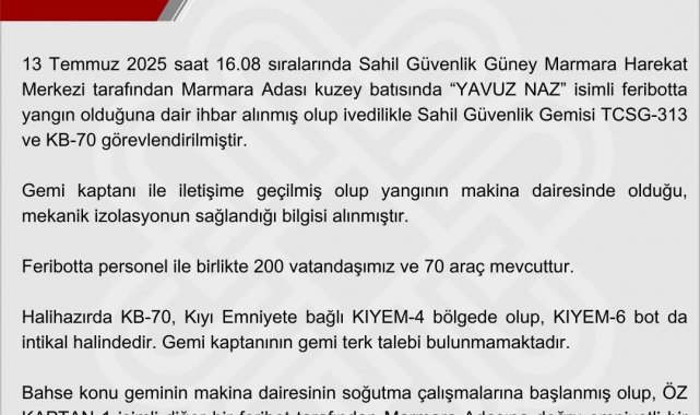 Balıkesir Valiliği'nden yapılan açıklamaya göre, Marmara Adası açıklarında "Yavuz Naz" isimli feribotun makine dairesinde yangın çıktı. Sahil Güvenlik Güney Marmara Harekat Merkezi koordinesinde bölgeye TCSG-313 ve KB-70 Sahil Güvenlik botlarının ardından Kıyı Emniyeti Genel Müdürlüğü'ne bağlı KIYEM-4 botu da sevk edildi. KIYEM-6 botunun ise intikal halinde olduğu öğrenildi.