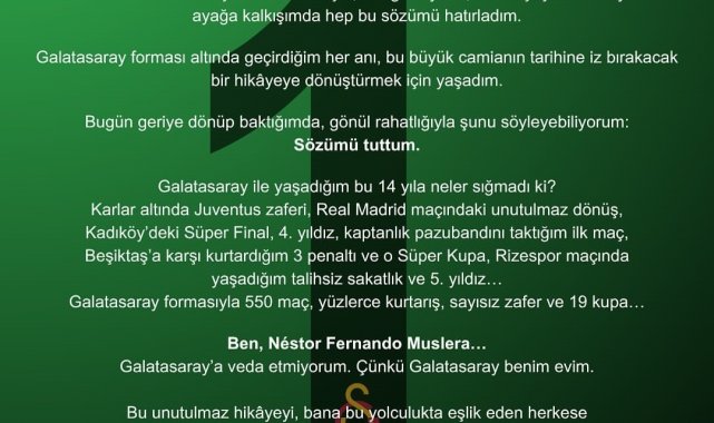 "Galatasaray'a imzayı attığım gün, daha sahaya bile çıkmadan, ilk röportajımda şunu söyledim: 'Galatasaray'a efsane olmaya geldim.' Bu, en başında bir hayaldi ve yıllar geçtikçe o hayal bir hedefe, hedef bir tutkuya, tutku ise bir mirasa dönüştü. Her kurtarışta, her galibiyette, her düşüşümde ve yeniden ayağa kalkışımda hep bu sözümü hatırladım. Galatasaray forması altında geçirdiğim her anı, bu büyük camianın tarihine iz bırakacak bir hikayeye dönüştürmek için yaşadım. Bugün geriye dönüp baktığımda, gönül rahatlığıyla şunu söyleyebiliyorum: Sözümü tuttum. Galatasaray ile yaşadığım bu 14 yıla neler sığmadı ki? Karlar altında Juventus zaferi, Real Madrid maçındaki unutulmaz dönüş, Kadıköy'deki Süper Final, 4. yıldız, kaptanlık pazubendini taktığım ilk maç, Beşiktaş'a karşı kurtardığım 3 penaltı ve o Süper Kupa, Rizespor maçında yaşadığım talihsiz sakatlık ve 5. yıldız... Galatasaray formasıyla 550 maç, yüzlerce kurtarış, sayısı zafer ve 19 kupa... Ben, Nestor Fernando Muslera... Galatasaray'a veda etmiyorum. Çünkü Galatasaray benim evim. Bu unutulmaz hikayeyi, bana bu yolculukta eşlik eden herkese teşekkür ederek tamamlıyorum. Birlikte savaştığım takım arkadaşlarıma, her an yanımda olan teknik ekiplere, kulüp çalışanlarına, bana güvenen yönetimlere, centilmence mücadele eden tüm rakiplerime ve en önemlisi, her koşulda arkamda duran büyük Galatasaray taraftarına sonsuz minnetle..."