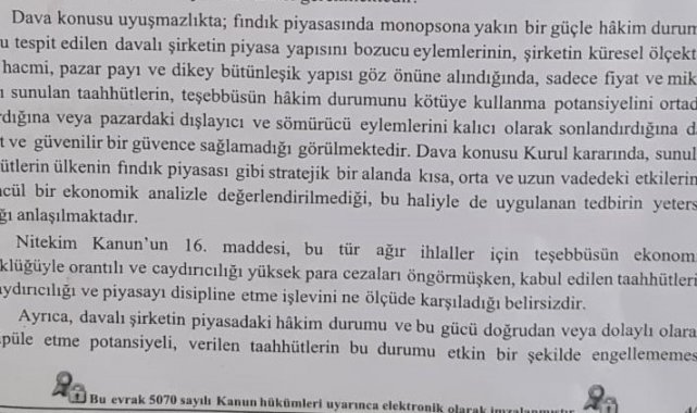 "Fındık piyasasında monopsona yakın bir güçle hakim durumda olduğu tespit edilen davalı şirketin piyasa yapısını bozucu eylemlerinin şirketin küresel ölçekteki ticari hacmi, pazar payı ve dikey bütünleşik yapısı göz önüne alındığında, sadece fiyat ve miktar odaklı sunulan taahhütlerin, teşebbüsün hakim durumu kötüye kullanma potansiyelini ortadan kaldırdığına ve pazardaki dışlayıcı ve sömürücü eylemlerini kalıcı olarak sonlandırdığına dair somut ve güvenilir bir güvence sağlamadığı görülmektedir."