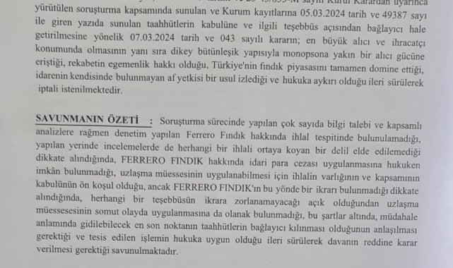 Ordu Büyükşehir Belediyesi kuruluşu ORTAR ve Ordu merkezli yerel bir fındık firması tarafından Ankara 15. İdare Mahkemesi'ne açılan davada fındık sektörünü yakından ilgilendiren bir karar çıktı. Ankara 15. İdare Mahkemesi, Ferrero'nun Mart 2024 tarihinde Rekabet Kurumu'na Türk hükümetinin açıkladığı fındık fiyatının altında alım yapmayacağına ilişkin verdiği taahhüdü yeterli bulmadı. Mahkeme, kararında şöyle denildi: