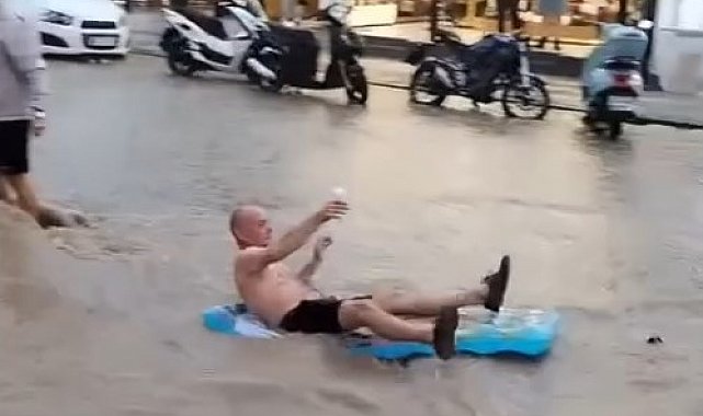 Muğla'nın Fethiye ilçesinde etkili olan sağanak yolları göle çevirirken, turistler sel sularında eğlendi.