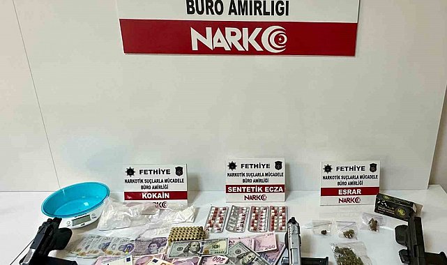 Muğla Emniyet Müdürlüğü Narkotik Suçlarla Mücadele Şube Müdürlüğü ile İstihbarat Şube Müdürlüğünce Fethiye ilçesinde yapılan müşterek çalışmada; Bin 256 gram esrar, 101 gram kokain, 49 adet sentetik ecza, 12 kök Hint keneviri, 3 adet ruhsatsız tabanca, 74 adet fişek, suçtan kazanıldığı değerlendirilen 132 bin 800 TL, 700 Dolar, 220 Pound, 70 Euro para ele geçirildi.