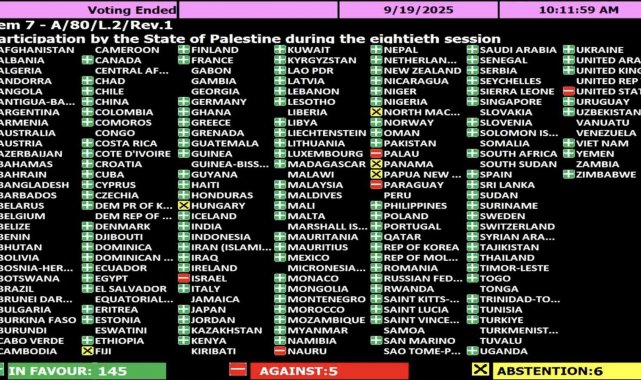 BM Genel Kurulu, Filistin Devlet Başkanı Mahmud Abbas'ın gelecek hafta ABD'nin New York şehrinde gerçekleştirilecek 80. Genel Kurul Toplantısı oturumuna katılmasına izin veren tasarıyı oylamaya sundu. "Filistin Devleti'nin 80. oturuma katılımı" başlıklı 156 ülkenin katıldığı oylamada, 145 ülke Abbas'ın katılımı lehinde oy kullanırken, 5 ülke aleyhinde, 6 ülke ise çekimser oy kullandı. Oylama sonucunda Filistin Devlet Başkanı Abbas'ın toplantıya video konferans yoluyla katılmasına izin veren tasarı kabul edildi.