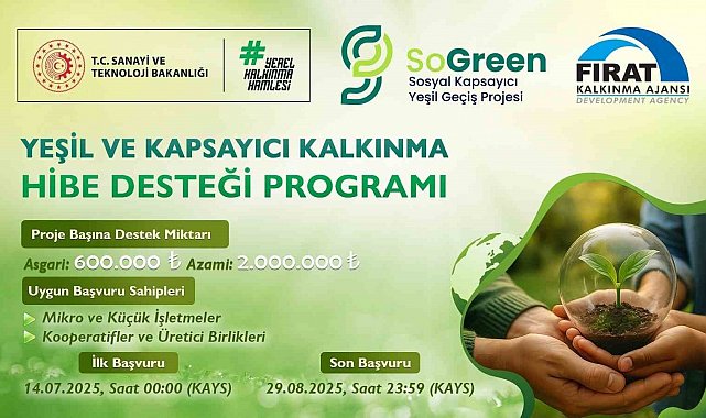 Sanayi ve Teknoloji Bakanlığı Kalkınma Ajansları Genel Müdürlüğü koordinasyonunda faaliyetlerini sürdüren Fırat Kalkınma Ajansı (FKA), Dünya Bankası finansmanıyla hayata geçirilen Türkiye Sosyal Kapsayıcı Yeşil Geçiş Projesi (SOGREEN) kapsamında "Yeşil ve Kapsayıcı Kalkınma Hibe Desteği Programı"nı ilan etti. Toplam bütçesi 28 milyon TL olan program kapsamında çevresel sürdürülebilirlik ve sosyal kapsayıcılık odağında geliştirilecek projelere hibe desteği sağlanacak.