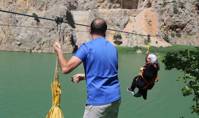 Karanlık Kanyon'da kurulan zipline hattı vatandaşlara Fırat Nehri'nin muhteşem manzarası eşliğinde heyecan dolu anlar yaşattı. Adrenaline doyan vatandaşlar ardından yer yer 400-500 metrelik sarp kayalık yamaçlardan oluşan kanyonda tekne turunun keyfini çıkardı.