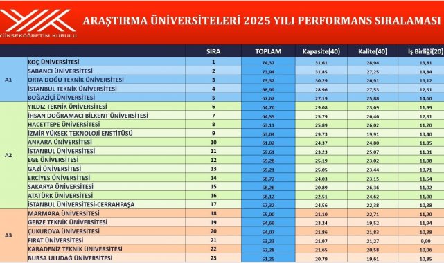 Yükseköğretim Kurulu (YÖK) tarafından gerçekleştirilen araştırma üniversiteleri toplantısı, bu yıl Yıldız Teknik Üniversitesinin ev sahipliğinde düzenlendi. YÖK Başkanı Prof. Dr. Erol Özvar, YÖK Başkan Vekili Prof. Dr. Naci Gündoğan ve araştırma üniversitelerinin rektör ve rektör yardımcılarının katıldığı toplantıda, Türkiye'nin en nitelikli araştırma üniversitelerinin performans ölçümleri açıklandı. Toplantıya Fırat Üniversitesi Rektörü Prof. Dr. Fahrettin Göktaş ve Rektör Yardımcısı Prof. Dr. Mehmet Yılmaz'da katıldı. Fırat Üniversitesi, 23 araştırma üniversitesi arasında yerini koruyarak bu yıl da geçen yıl olduğu gibi A3 kategorisinde yer aldı. Fırat Üniversitesi kapasite alanında geçen yıl 17 olan puanını 21,97'ye, kalite alanında 16 olan puanını 21,27'ye, iş birliği alanında 5 olan puanını ise 9,99'a yükseltmeyi başardı. Kapasite, kalite ve iş birliği alanlarının toplam puanı geçen yıl 38 olan Fırat Üniversitesi bu yıl puanını 53,23'e yükselterek listede 21. sırada yer aldı. Üniversite, devlet üniversiteleri arasında ise 18. sıraya yerleşti.