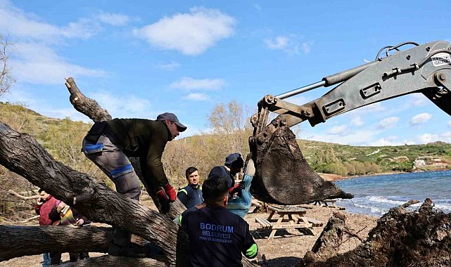 Belediye ekipleri, Bodrum'da fırtınada devrilen ılgın ağaçlarını tekniğine uygun şekilde budayarak bulundukları alana yeniden dikiyor.