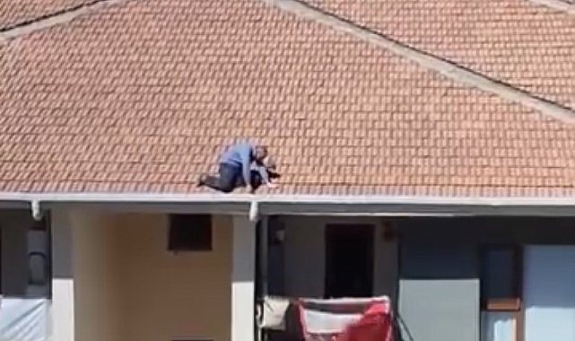 Olay, merkeze bağlı Güneykent Mahallesi'nde meydana geldi. Edinilen bilgiye göre, kent genelinde etkili olan fırtınaya aldırış etmeyen bir vatandaş, hiçbir önlem almadan çatıda çalışma yaptı. Yüreklerin ağza geldiği anlar ise bir vatandaşın cep telefonu kamerasına yansıdı.