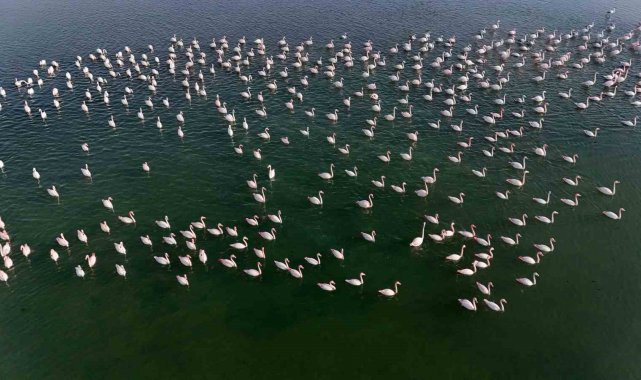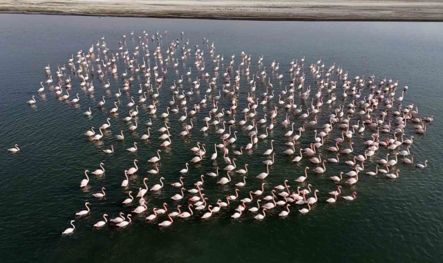 Göçmen kuşların Kuzey Afrika'dan İran'a uzanan yolculuğunda en önemli konaklama merkezlerinden Van Gölü havzası, sulak alanlarıyla çok sayıda türden binlerce kuşu bünyesinde barındırıyor. Van'ın doğusunda yer alan, eşsiz doğal güzelliği ve biyolojik çeşitliliğiyle dikkat çeken Erçek Gölü, her yıl olduğu gibi bu yıl da flamingoların göç yolculuğunda uğrak noktası oldu. Pembe tüyleri, uzun zarif boyunları ve estetik duruşlarıyla doğa tutkunlarının gözdesi olan flamingolar, hava sıcaklığının mevsim normallerinin üzerinde seyrettiği bölgede konaklama sürelerini uzattı. Başta İran'ın Urumiye Gölü olmak üzere birçok gölün kuruması sonrası Van Gölü kıyıları ve Erçek Gölü'nde konaklayan flamingolar bölge ekosistemine canlılık katmaya devam ediyor. Suya düşen nazlı gölgeleri ve sakin danslarıyla Erçek Gölü'nde görsel şölen oluşturan flamingolar havadan dronla görüntülendi.