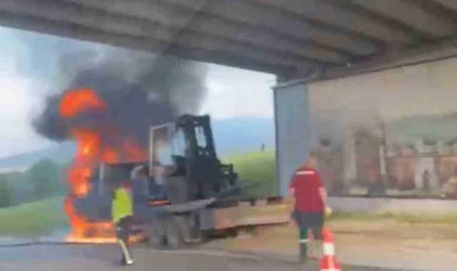 Bursa'da forklift yüklü kamyon, seyir halindeyken çıkan yangında kullanılamaz hale geldi.