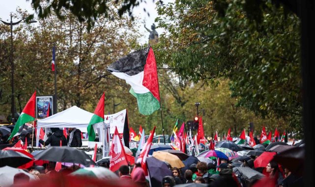 Fransa'nın başkenti Paris'te yaklaşık 60 bin kişi sağanak yağışa rağmen Filistin'e destek için yürüdü.