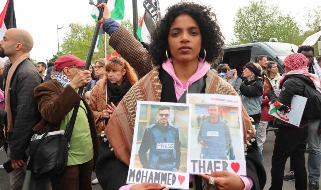 Fransa'da bir araya gelen gazeteciler, İsrail'in saldırıları sonucu Gazze Şeridi'nde hayatını kaybeden meslektaşlarını anarak, İsrail saldırılarını protesto etti.