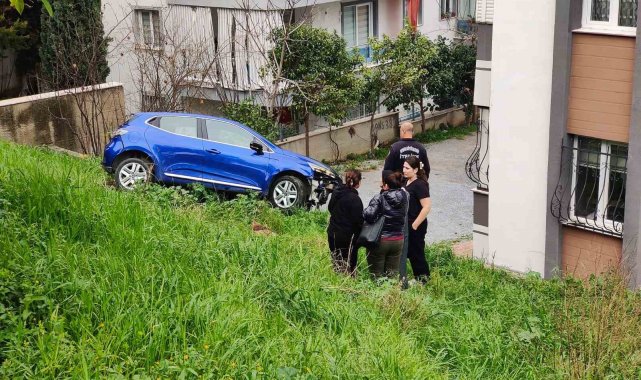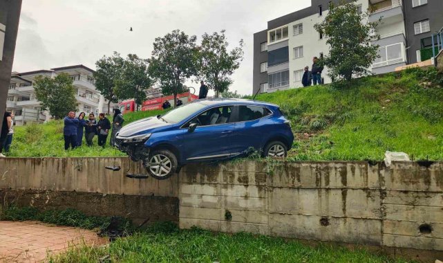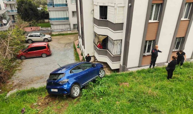 Aydın'ın Kuşadası ilçesinde iddiaya göre sürücünün fren yerine gaza basması sonucu kontrolden çıkan araç bir sitenin bahçesine yuvarlandı.