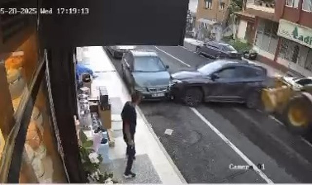 Hatay'da freni arızalanan kepçe sürücüsünün kontrolünden çıkarak park halindeki ve trafikteki 4 araca çarptı. Kepçe sürücüsü hafif şekilde yaralanırken, kaza anı kameraya yansıdı.