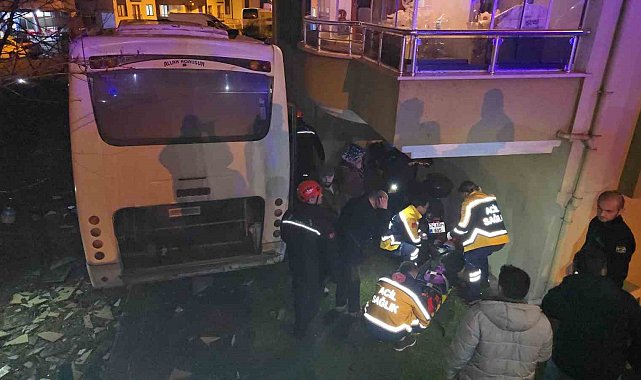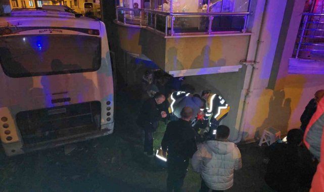 Freni boşalan midibüs park halindeki araçlara çarpıp apartman boşluğuna düştü