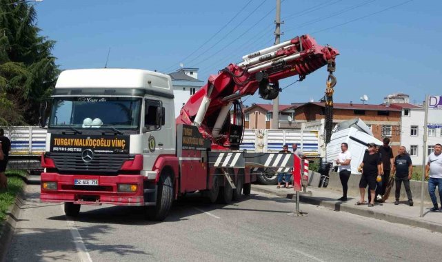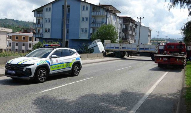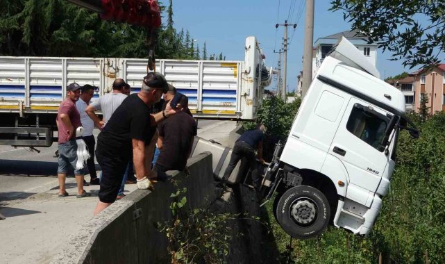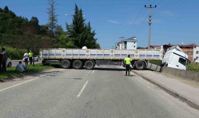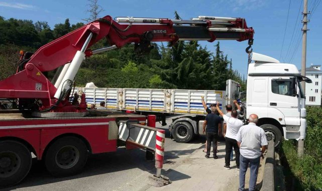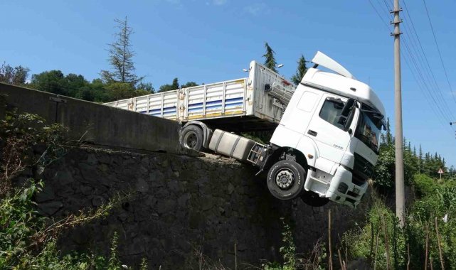 Ordu'nun Altınordu ilçesinde saman yükünü boşalttığı esnada freni boşalan tır yola sürüklendi, istinat duvarını yıkarak asılı kaldı. Bir motosikletli durumu fark edip trafiği durdurarak muhtemel facianın önüne geçti.