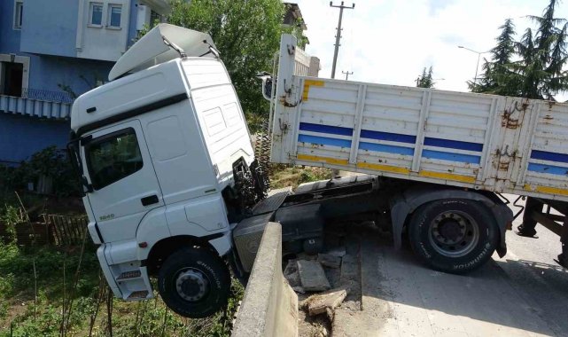 Freni boşalan tır yola sürüklendi, istinat duvarında asılı kaldı