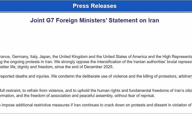 ABD, Japonya, İngiltere, Almanya, Fransa, Kanada ile İtalya'dan oluşan ve Avrupa Birliği'nin de temsil edildiği G7 grubunun dışişleri bakanları, İran'daki gelişmelerle ilgili ortak bir yazılı açıklama yayınladı. İran rejiminin protestoculara yönelik baskıcı tutumundan derin endişe duyulduğu vurgulanan açıklamada, "İranlı yetkililerin, 2025 yılının Aralık ayı sonundan bu yana daha iyi bir yaşam, haysiyet ve özgürlük için meşru taleplerini cesurca dile getiren İran halkına yönelik acımasız baskısının yoğunlaşmasına şiddetle karşı çıkıyoruz" denildi. Bildirilen yüksek ölü ve yaralı sayılarının endişe verici olduğu aktarılan açıklamada, "Güvenlik güçlerinin protestoculara karşı kasıtlı şiddet kullanmasını, protestocuları öldürmesini, keyfi gözaltıları ve sindirme taktiklerini kınıyoruz" ifadeleri kullanıldı.