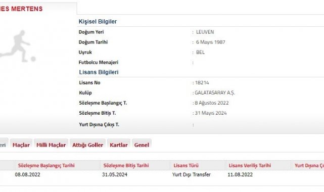 Galatasaray, mayıs sonunda sözleşmesi sona erecek olan Dries Mertens ile 1 yıl daha anlaştığını Türkiye Futbol Federasyonu'na (TFF) bildirdi. Sarı-kırmızılılar, Belçikalı futbolcunun gösterdiği başarılı performansla, sezon başında 1+1 yıllık sözleşme opsiyonunu kullanarak 2024 Haziran ayına kadar uzattı. 36 yaşındaki orta saha, bu sezon 31 resmi maçta 7 gol atarken, 4 asistlik performans sergiledi.