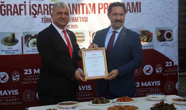 Hatay Valisi Mustafa Masatlı, 2 yıl içinde yapılan çalışmalarla coğrafi işaret tescil sayısını 50'ye çıkardıklarını ifade ederek "Tarihi yüz binlere dayanan şehrimizin her yanı ve yönüyle yeniden ihya, inşa ve imarı noktasında da bizler afette Hatay modeli olarak ifade ettiğimiz çalışmalara başladık. Bu çalışmalarımızdan bir tanesi de coğrafi işaretli ürün sayımızın arttırılmasıyla ilgiliydi. Şehrimizde şu ana kadar yapmış olduğumuz tespitlerde 600'den fazla yemek çeşidi var. Tescil olarak baktığımızda 5 Şubat 2023 tarihi itibariyle 25 olan coğrafi işaretimiz, bizler çalışmalarımızı bu alanda yoğunlaştırarak şu an itibariyle 50'ye çıkartmış durumdayız. Yani 2 yıllık bir süreçte coğrafi işaretli ürün sayımız neredeyse 2 katına çıkmış durumda. 80 coğrafi işaret de devam ediyor. İnşallah önümüzdeki yılbaşına kadar bu çalışmalarımızda meyvelerini verecektir. 130'a yakın ürünümüzün coğrafi işaretini almış olacağız. Coğrafi işaretini biz bir milli mesele olarak görüyoruz. Çünkü bir ürünün mahrecini menşeini ancak bu şekilde algılayabiliriz. O bakımdan bu coğrafi işaretler hem bizim kültürümüzün zenginliğini hem insanlarımızın bu noktadaki emeklerini bir manada tescil etmek anlamına geliyor. Bu 10 coğrafi işaretimizin, başta Hatay'ımız olmak üzere hayırlı olmasını diliyorum" dedi.