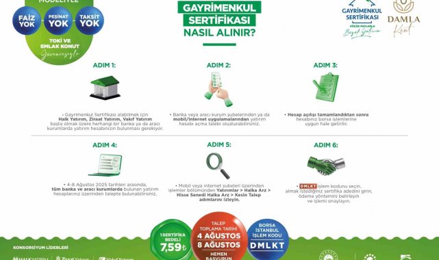 Gayrimenkul Sertifikası için talep toplama sürecinin 4 Ağustos'ta başlayacağı ve 8 Ağustos'ta sona ereceği belirtildi. Sertifikaların, Borsa İstanbul'da "DMLKT" işlem kodu ile alınabileceği kaydedildi.