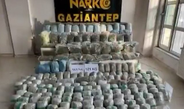 Gaziantep'te İl Emniyet Müdürlüğü Narkotik Suçlarla Mücadele Şube Müdürlüğü ekipleri ve Cumhuriyet Başsavcılığı koordinesinde uyuşturucu tacirlerine yönelik operasyon yapıldı. Operasyon çerçevesinde belirlenen bir araçta arama yapıldı. Hassas burunlu dedektör köpek destekli aramalar sonucunda tırdaki ürünlerin arasına gizlenmiş halde 121 kilo skunk ele geçirildi.