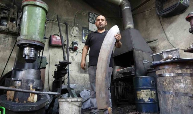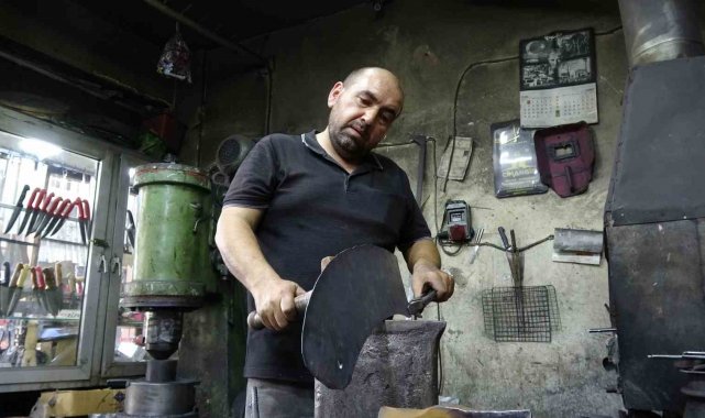 Demir parçalarını çekiçle döverek kazma, kürek, satır ve bıçak gibi aletlere dönüştürüyor