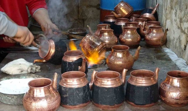 Esnaf ve vatandaşlarca getirilen bakır eşyaları ocaktaki ateşi körükleyerek kalaylayan ustalar, siparişleri yetiştirmek için büyük emek sarf ediyor.