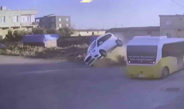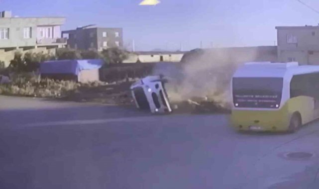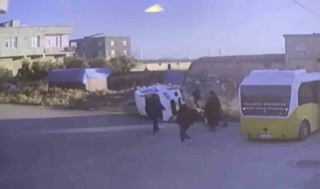Şehir içi yolcu taşımacılığı yapan minibüs ile hafif ticari aracın çarpıştığı kaza anları ise bir iş yerinin güvenlik kamerasına yansıdı. Görüntülerde, iki aracın kavşakta çarpışma ve sonrasın savrulan hafif ticari aracın yol kenarındaki taşa çarparak yan yatma anları yer aldı.