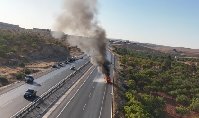 Gaziantep-Nizip karayolunda seyir halindeki otomobil alev topuna döndü. Yanan otomobil ve oluşan yoğun trafik, dron ile havadan görüntülendi.