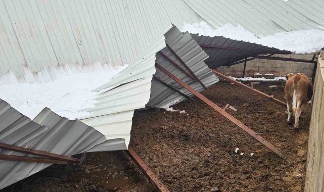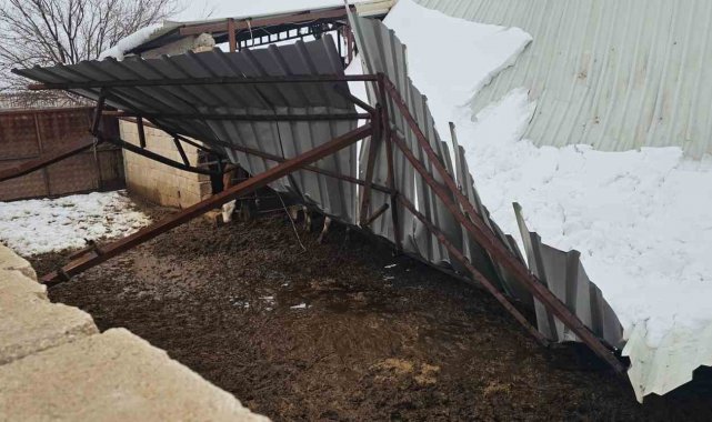 Gaziantep'te etkili olan yoğun kar yağışı, kırsal bir mahallede bulunan ahırın çatısının çökmesine neden oldu.