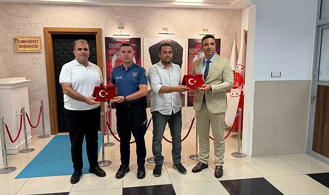 Antalya'nın Gazipaşa ilçesinde ailesiyle birlikte yürüyen kişiye silahlı saldırı düzenleyen şüpheliyi kısa sürede yakalayan polis memurları, Cumhuriyet Başsavcısı Tarık Korkmaz tarafından başarı belgesi ve plaketle ödüllendirildi.