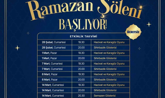 "Ramazan Şöleni" kapsamında her hafta sonu gerçekleştirilecek programda; Hacivat & Karagöz sahne oyunu, sihirbazlık gösterileri, ney dinletisi ve semazen gösterileri yer alacak. Ramazan akşamlarının vazgeçilmez geleneksel eğlenceleri hem çocuklara hem de yetişkinlere özel anlar yaşatacak.