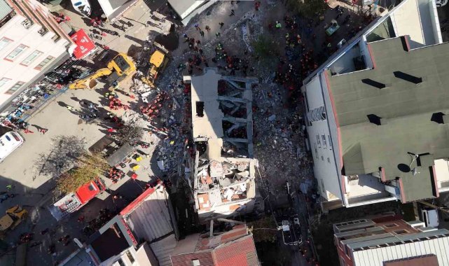 Kocaeli'nin Gebze ilçesinde aynı aileden 5 kişinin enkaz altında kaldığı binada devam eden arama çalışmalarında 10 saat geride kalırken, kurtarma seferberliği havadan görüntülendi.