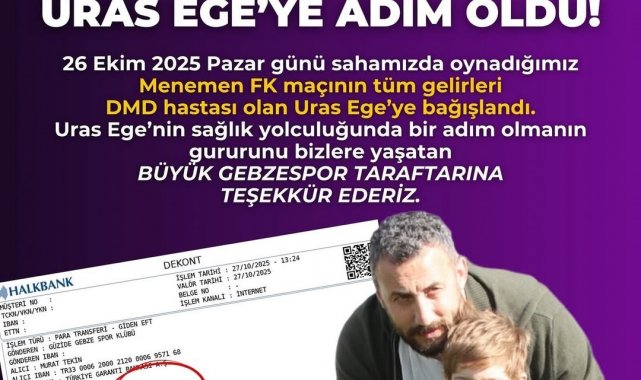 TFF 2. Lig ekibi Gebzespor, hafta sonu Menemen FK ile oynadığı maçın bilet gelirlerini DMD hastası Uras Ege'ye bağışlayacağını ilan etmişti. Kulüp, 576 bin 630 TL'yi ailenin valilik izinli hesabına yatırdı.