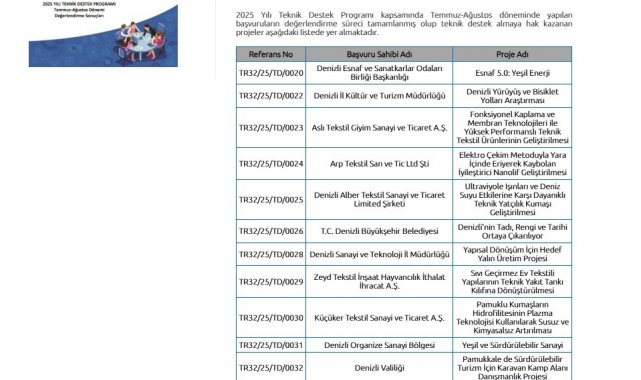 Güney Ege Kalkınma Ajansı (GEKA) tarafından yürütülen 2025 Yılı Teknik Destek Programı kapsamında destek almaya hak kazanan projeler belli oldu. Denizli Organize Sanayi Bölgesi Müdürlüğü tarafından hazırlanan "Yeşil ve Sürdürülebilir Sanayi" projesi, Temmuz-Ağustos dönemi başvuruları arasında başarılı bulunarak destek almaya hak kazandı.