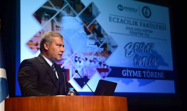 Törenin açılış konuşmasını yapan Anadolu Üniversitesi Rektörü Prof. Dr. Yusuf Adıgüzel, "Bu mutlu günde sizlerle beraber olabilmek benim için büyük bir onur kaynağı. Eczacılık Fakültesi okulumuzun en köklü fakültelerinden bir tanesi. Bugün siz değerli öğrencilerimiz beyaz önlüklerinizi giyerek eczacılık sektörüne adım atacak meslektaşlar olarak buradasınız. Bugün bizim heyecanımıza ortak olan bir de velilerimiz var. Şüphesiz ki Anadolu Üniversitesi gibi başarılı bir okulda okuma şansını elde ettiyseniz arkanızda duran büyüklerinizin katkıları çok fazladır. Herkes heyecanımızı paylaşmak için burada. Eğitim sürecinizde de bizler ve kıymetli hocalarınız yanınızda olacaklar. Eczacılık Fakültesi, üniversitemizin bilimsel ve akademik anlamda en başarılı fakülteleri arasında yer alıyor. Hatta sadece üniversitemizin değil Türkiye'deki diğer üniversitelerin de öncülüğünü yapıyor. Anadolu Üniversitesi bir tıp fakültesi olmamasına rağmen Uluslararası THE endeksinde sağlık alanında 400-500 bandında bir üniversite. Türkiye'de de üçüncü sırada olması Eczacılık Fakültesi akademisyenlerimizin başarısının bir göstergesidir. Fakültemiz sadece eğitim alanında değil, eğitim dışında da sektöre yaptığı buluş ve patentlerle önemli bir katkı sunuyor" dedi.