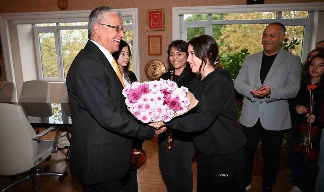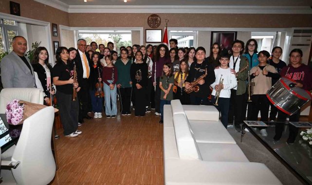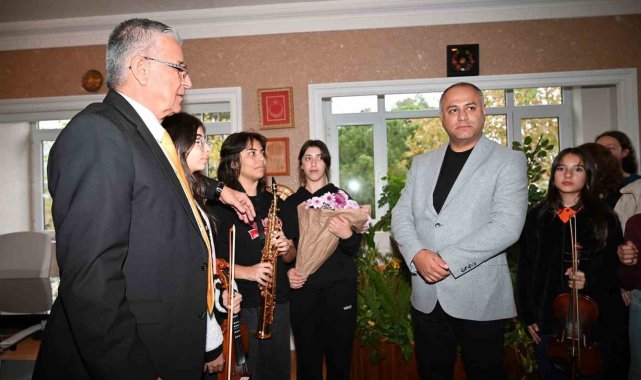 Kemer Belediyesi ATSO Eğitim ve Sanat Merkezi'nde ücretsiz müzik eğitimi alan Kemer Belediyesi Gençlik Orkestrası öğrencileri, Orkestra Şefi Furkan Üstündağ ile Öğretmenler Günü dolayısıyla Kemer Belediye Başkanı Necati Topaloğlu'nu ziyaret ederek gününü kutladı.