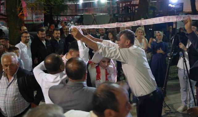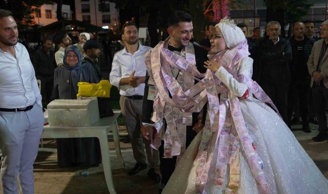 Bilecik'te bir düğünde gelin ile damada boyu 15 metreye ulaşan para kurdelesi takıldı.