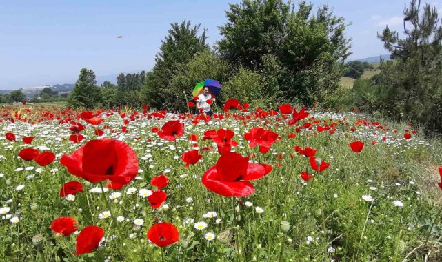 Bolu'da yol kenarında bulunan gelincik ve papatyalar, görenlerin dikkatini çekiyor. Yaklaşık 10 dönümlük tarlayı kaplayan çiçekler, özellikle fotoğraf tutkunlarına görsel şölen sunuyor.