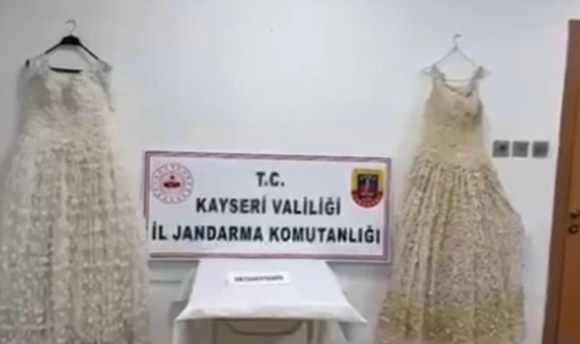 Kayseri'de jandarma ekipleri tarafından yapılan çalışmalarda iki gelinliğin üzerine boncuk şeklinde işlenmiş ve emdirilmiş 25 kilo 400 gram uyuşturucu madde ele geçirildi.